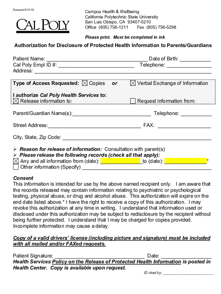Revised 6/17/16Campus Health & Wellbeing California Polytechnic State University San Luis Obispo, CA 934070210 Office (805) 7561211 Fax (805) 7565298 Please print. Must be completed in authorization