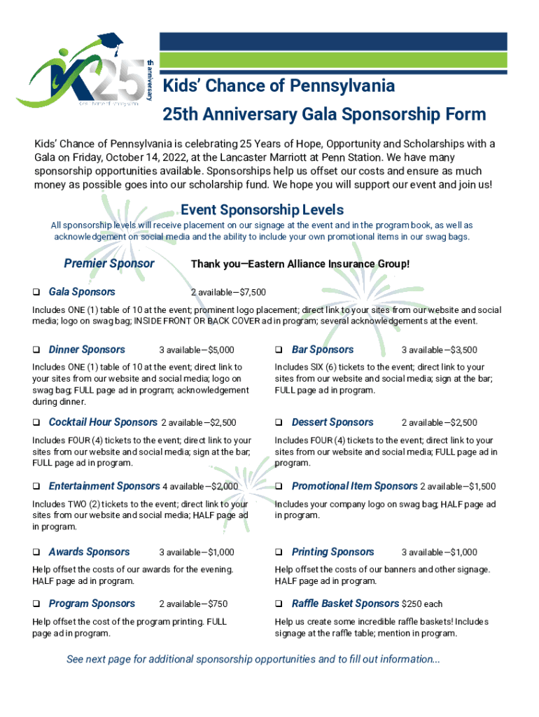 Kids Chance of Pennsylvania 25th Anniversary Gala Sponsorship Form Kids Chance of Pennsylvania is celebrating 25 Years of Hope, Opportunity and Scholarships with a Gala on Friday, October 14, 2022,