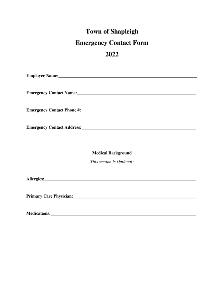Town of Chaplain Emergency Contact Form 2022 Employee Name:___Emergency Contact Name:___Emergency Contact Phone #:___Emergency Contact Address:___Medical Background This section is Optional:Allergies:___Primary