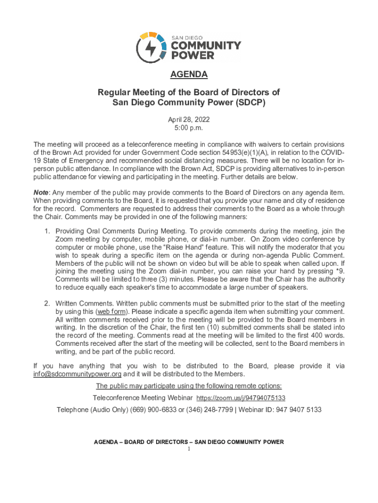 AGENDA Regular Meeting of the Board of Directors of San Diego Community Power (SDC) April 28, 2022 5:00 p.m. The meeting will proceed as a teleconference meeting in compliance with waivers to certain