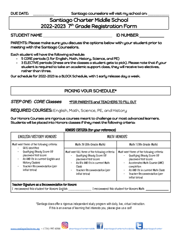 DUE DATE:___Santiago counselors will visit my school on: ___Santiago Charter Middle School 20222023 7th Grade Registration Form STUDENT NAME ___ ID NUMBER ___ PARENTS: Please make sure you discuss