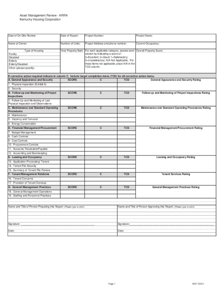 Asset Management Review AREA Kentucky Housing CorporationDate of Onsite Review:Date of Report:Project Number:Project Name:Name of Owner:Number of Units:Project Address and phone number:Current Occupancy:Type