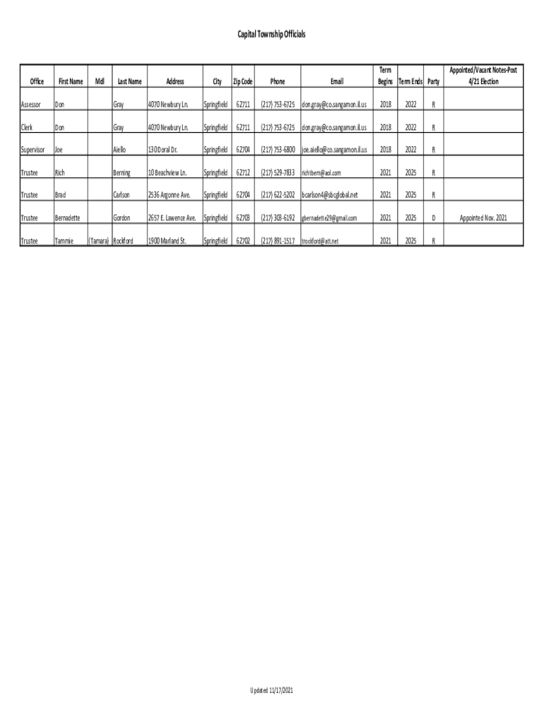 Capital Township OfficialsOfficeFirst NameMdlLast NameAddressCityZip CodePhoneEmailTerm