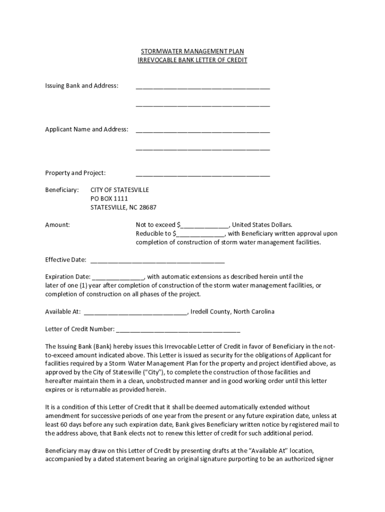 STORMWATER MANAGEMENT PLAN IRREVOCABLE BANK LETTER OF CREDITIssuing Bank and Address:___ ___Applicant Name and Address:___ ___Property and Project: Beneficiary:Amount:___CITY OF BATESVILLE PO BOX