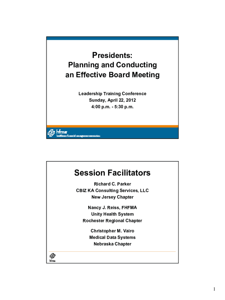 Presidents: Planning and Conducting an Effective Board Meeting Leadership Training Conference Sunday, April 22, 2012 4:00 p.m. 5:30 p.m. Session Facilitators Richard C. Parker CBI A Consulting service,