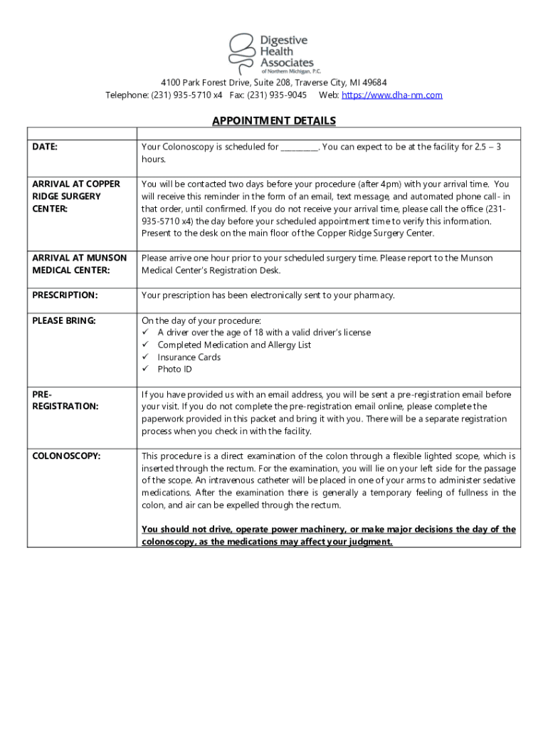 4100 Park Forest Drive, Suite 208, Traverse City, MI 49684 Telephone: (231) 9355710 x4 Fax: (231) 9359045 Web: https://www.dhanm.comAPPOINTMENT DETAILS DATE:Your Colonoscopy is scheduled for ___.