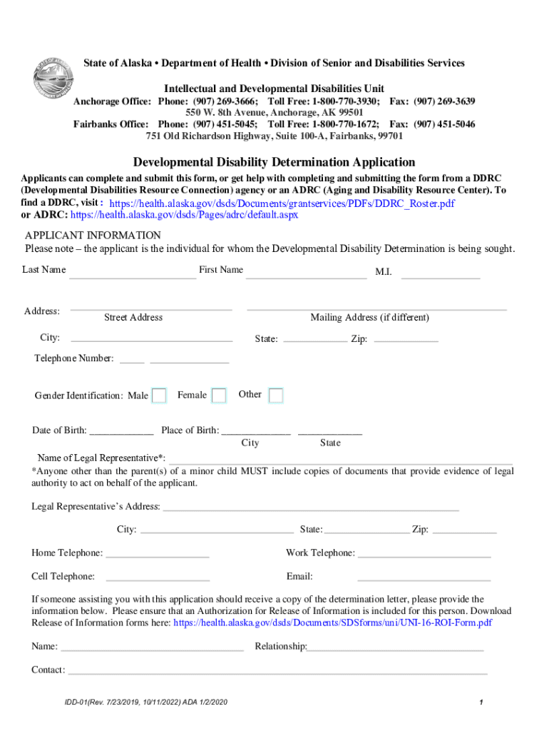 State of Alaska Department of Health Division of Senior and Disabilities Services Intellectual and Developmental Disabilities Unit Anchorage Office: Phone: (907) 2693666; Toll Free: 18007703930; Fax: