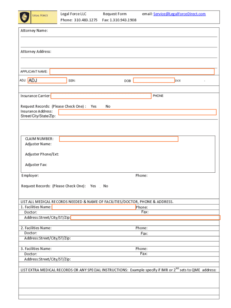 Legal Force LLC Phone: 310.483.1275Request Form Fax: 1.310.943.1908email: Service@LegalForceDirect.comAttorney Name:Attorney Address:APPLICANT NAME: ADJ:ADJUST:DOI DOB:Insurance Carrier: Request Records: