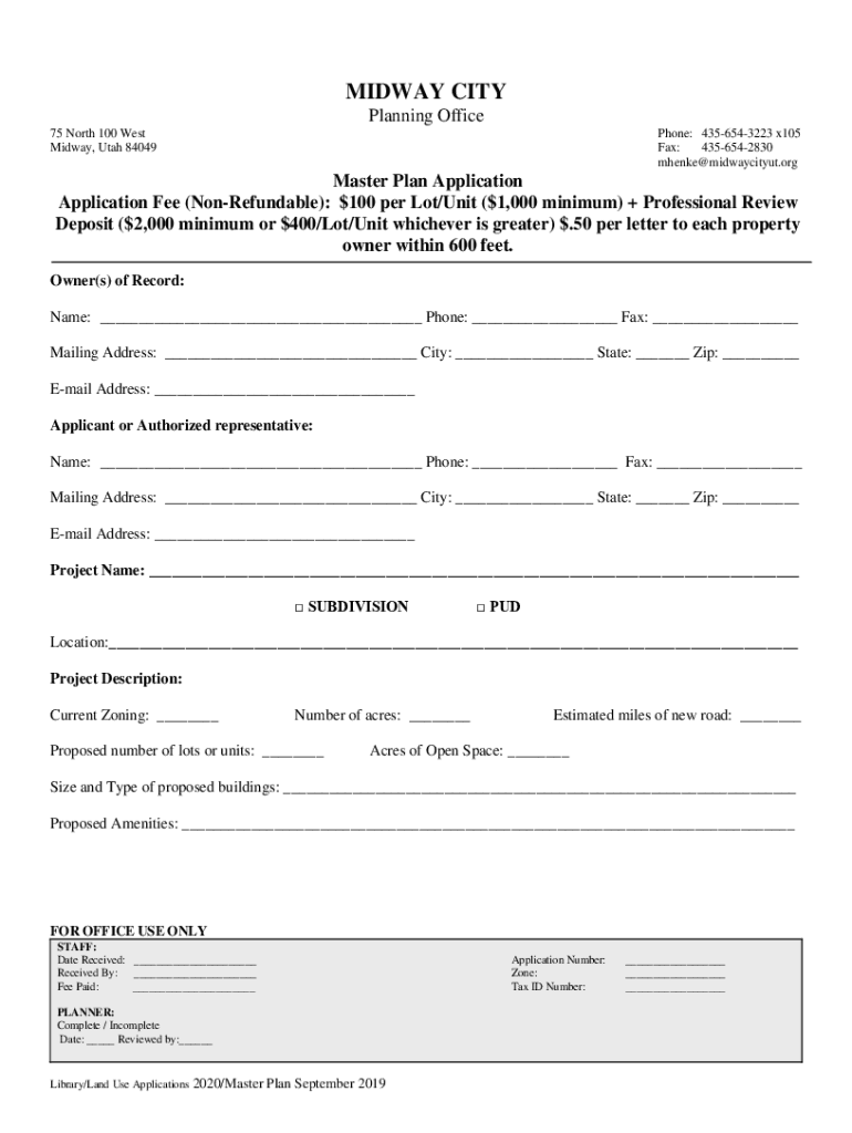 MIDWAY CITY Planning Office 75 North 100 West Midway, Utah 84049Phone: 4356543223 x105 Fax: 4356542830 mhenke@midwaycityut.orgMaster Plan Application Fee (NonRefundable): $100 per Lot/Unit ($1,000