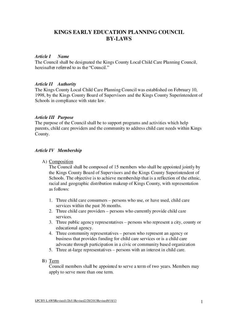 KINGS EARLY EDUCATION PLANNING COUNCIL BYLAWS Article I Name The Council shall be designated the Kings County Local Child Care Planning Council, hereinafter referred to as the Council. Article II