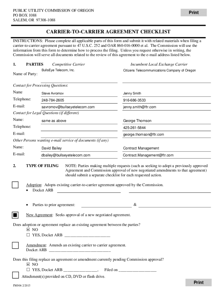 PUBLIC UTILITY COMMISSION OF OREGON PO BOX 1088 SALEM, OR 973081088PrintCARRIERTOCARRIER AGREEMENT CHECKLIST INSTRUCTIONS: Please complete all applicable parts of this form and submit it with related