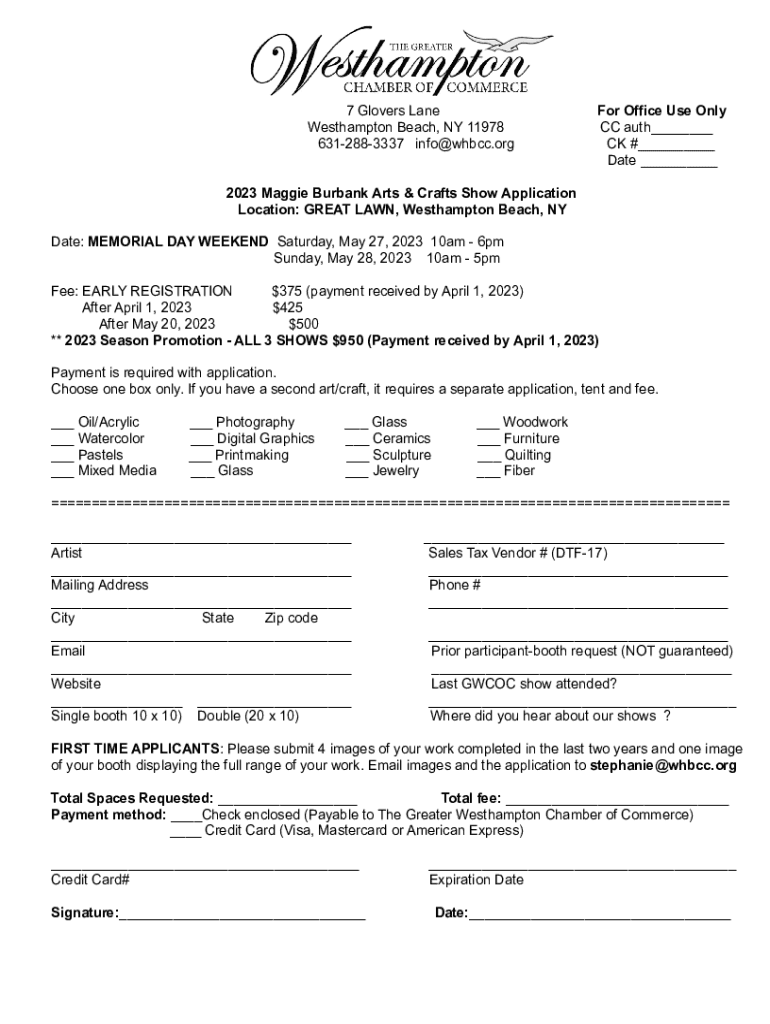 7 Glovers Lane Southampton Beach, NY 11978 6312883337 info@whbcc.orgFor Office Use Only CC auth___ CK #___ Date ___2023 Maggie Burbank Arts & Crafts Show Application Location: GREAT LAWN, Southampton