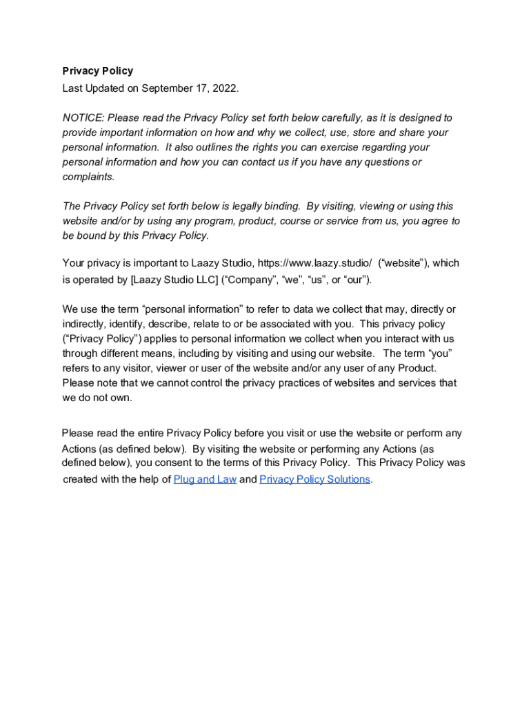 Privacy Policy Last Updated on September 17, 2022. NOTICE: Please read the Privacy Policy set forth below carefully, as it is designed to provide important information on how and why we collect, use,