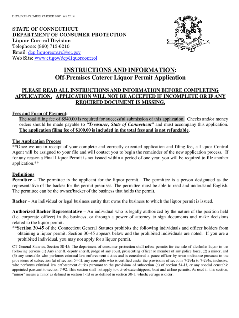 DCP LC PREMISES CATERER INST rev 7/14STATE OF CONNECTICUT DEPARTMENT OF CONSUMER PROTECTION Liquor Control Division Telephone: (860) 7136210 Email: dcp.liquorcontrol@ct.gov Website: www.ct.gov/dcp/liquorcontrolINSTRUCTIONS