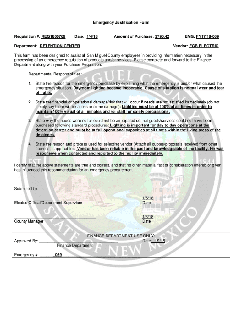 Emergency Justification FormRequisition #: REQ1800769Date: 1/4/18Amount of Purchase: $790.42Department: DETENTION CENTERED: FY17/18069 Vendor: EGG Electricians form has been designed to assist all