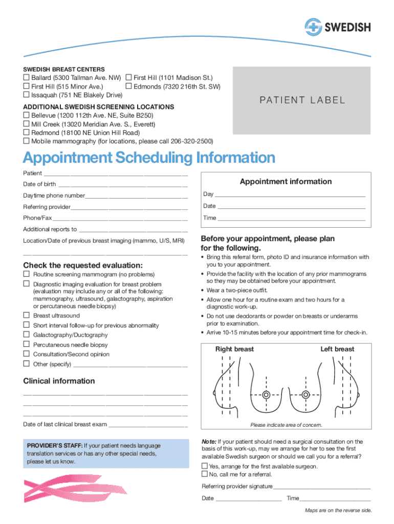 SWEDISH BREAST CENTERS Ballard (5300 Tillman Ave. NW)First Hill (515 Minor Ave.) Issaquah (751 NE Blakely Drive)First Hill (1101 Madison St.) Edmonds (7320 216th St. SW)PAT I E N T L A B EL ADDITIONAL