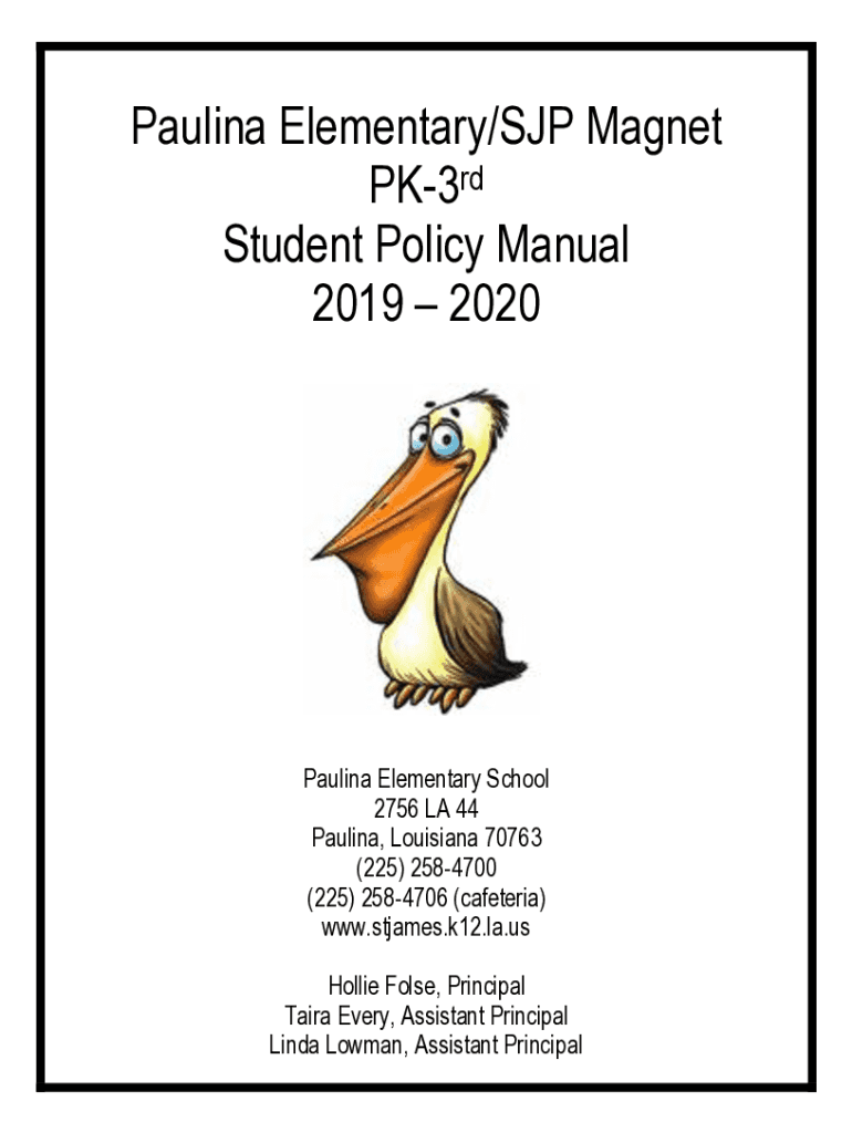 Paulina Elementary/SJP Magnet PK3rd Student Policy Manual 2019 2020Paulina Elementary School 2756 LA 44 Paulina, Louisiana 70763 (225) 2584700 (225) 2584706 (cafeteria) www.stjames.k12.la.us Hollie