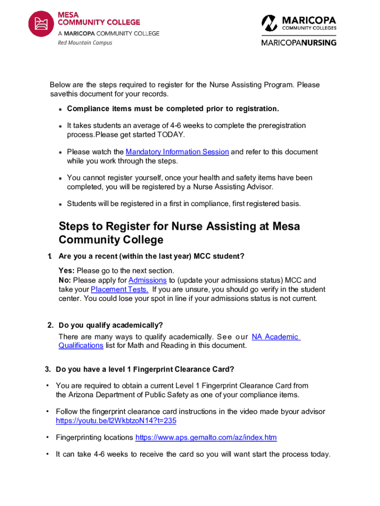 Below are the steps required to register for the Nurse Assisting Program. Please save this document for your records. Compliance items must be completed prior to registration. It takes students an