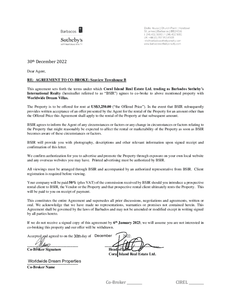 30th December 2022 Dear Agent, RE: AGREEMENT TO BROKE: Sea view Townhouse B This agreement sets forth the terms under which Coral Island Real Estate Ltd. trading as Barbados Sotheby International