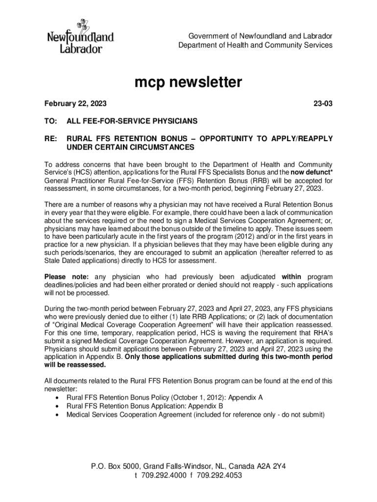 February 22, 20232303TO:ALL FEEFORSERVICE PHYSICIAN SRE:RURAL FFS RETENTION BONUS OPPORTUNITY TO APPLY/REAPPLY