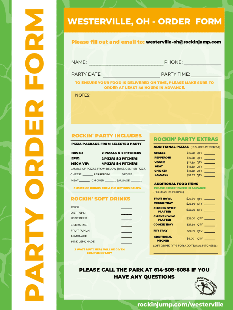 PARTY ORDER FORMWESTERVILLE, OH ORDER FORM Please fill out and email to: westervilleoh@rockinjump.comNAME:PHONE:PARTY DATE:PARTY TIME:TO ENSURE YOUR FOOD IS DELIVERED ON TIME, PLEASE MAKE SURE TO