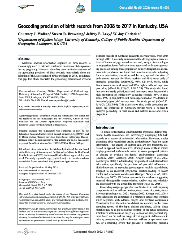 Geospatial Health 2022; volume 17:1020Geocoding precision of birth records from 2008 to 2017 in Kentucky, USA Courtney J. Walker,1 Steven R. Browning,1 Jeffrey E. Levy,2 W. Jay Christian1Department
