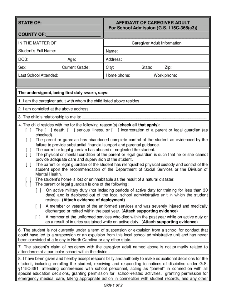 STATE OF:___AFFIDAVIT OF CAREGIVER ADULT For School Admission (G.S. 115C366(a3))COUNTY OF:___ IN THE MATTER Caregiver Adult InformationStudents Full Name: DOB: Sex:Name: Age: Current Grade:Last School