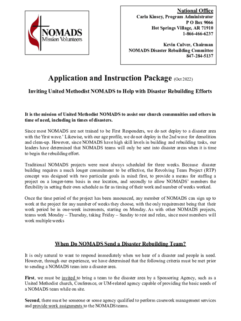 National Office Carla Kinsey, Program Administrator P O Box 9066 Hot Springs Village, AR 71910 18664666237 Kevin Culver, Chairman NOMADS Disaster Rebuilding Committee 8472845137Application and Instruction