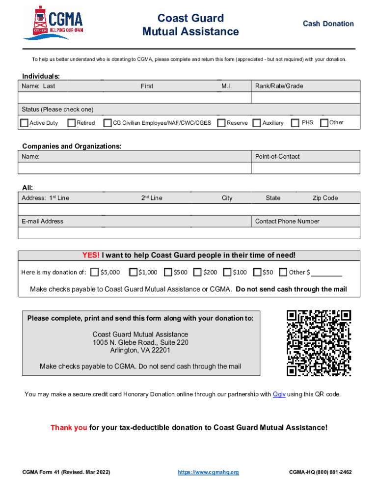 Coast Guard Mutual Assistance Cash Donation help us better understand who is donating to CGMA, please complete and return this form (appreciated but not required) with your donation. Individuals:
