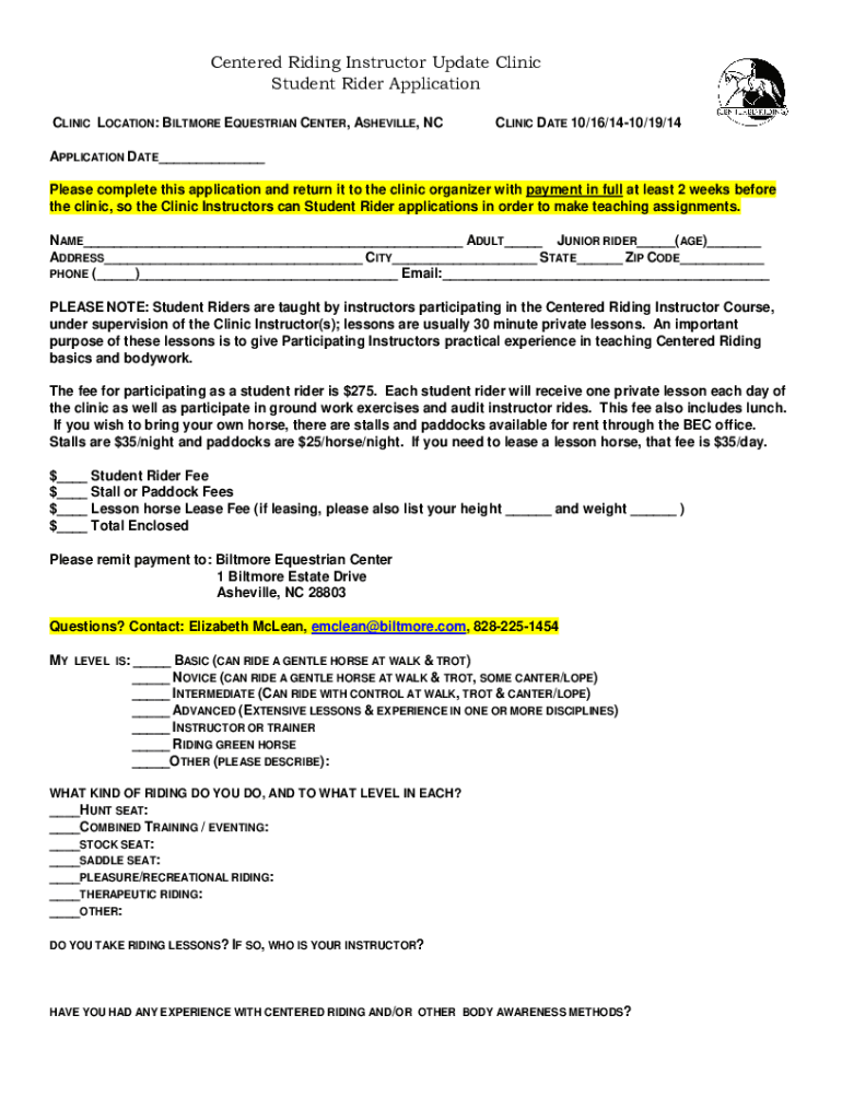 Centered Riding Instructor Update Clinic Student Rider Application CLINIC LOCATION: BILTMORE EQUESTRIAN CENTER, ASHEVILLE, CLINIC DATE 10/16/1410/19/14APPLICATION DATE___ Please complete this application