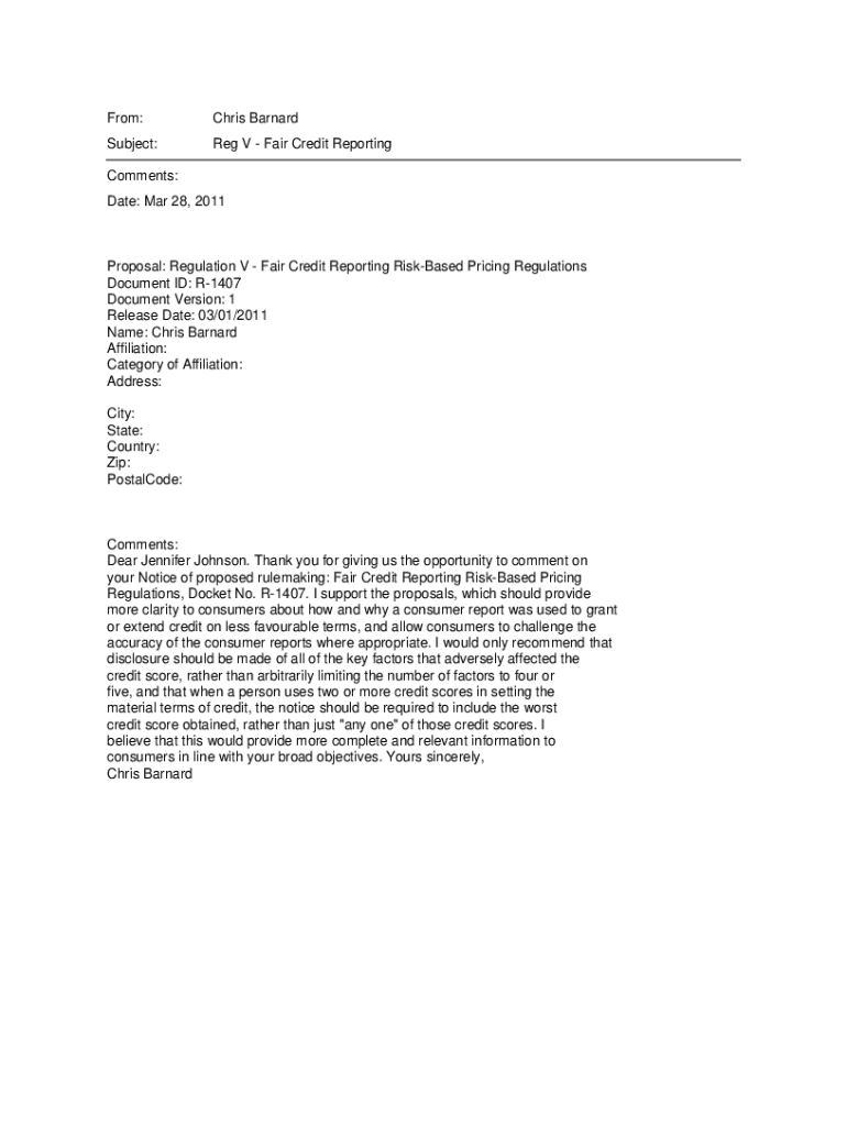 From:Chris BarnardSubject:Reg V Fair Credit ReportingComments: