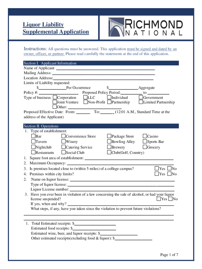 Liquor Liability Supplemental Application Instructions: All questions must be answered. This application must be signed and dated by an owner, officer, or partner. Please read carefully the statements
