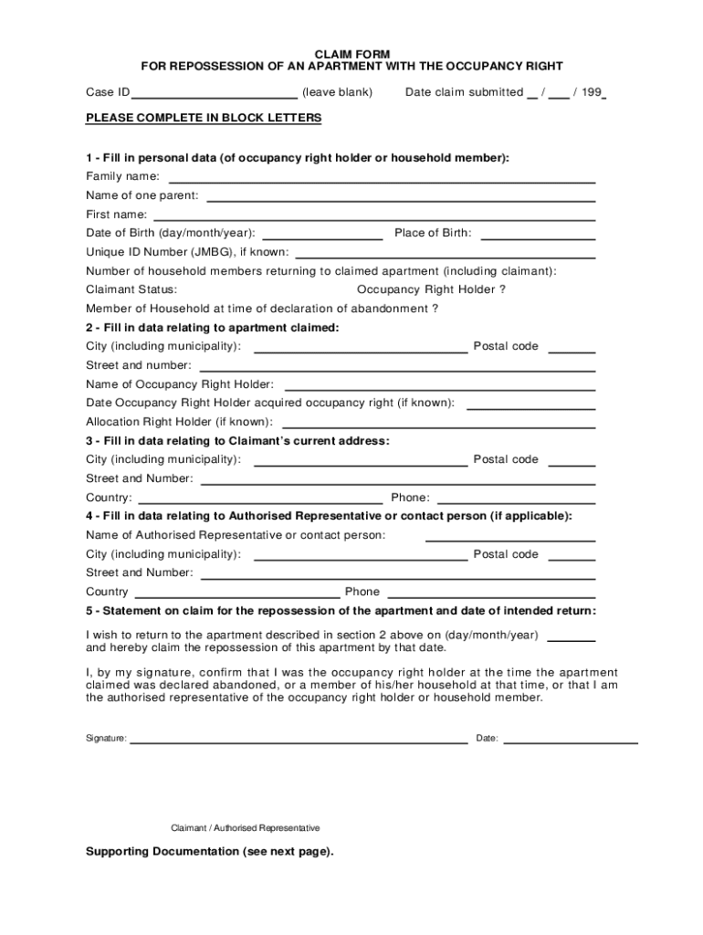 CLAIM FORM FOR REPOSSESSION OF AN APARTMENT WITH THE OCCUPANCY RIGHT Case ID(leave blank)Date claim submitted// 199PLEASE COMPLETE IN BLOCK LETTERS1 Fill in personal data (of occupancy right holder