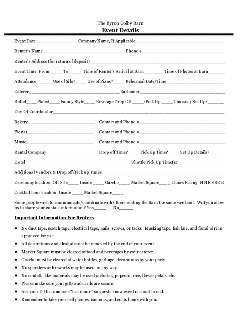 The Byron Colby Prevent Details Event Date___ Company Name, If Applicable___ Renters Name___Phone #___ Renters Address (for return of deposit)___ Event Time: From___To___ Time of Renters Arrival at