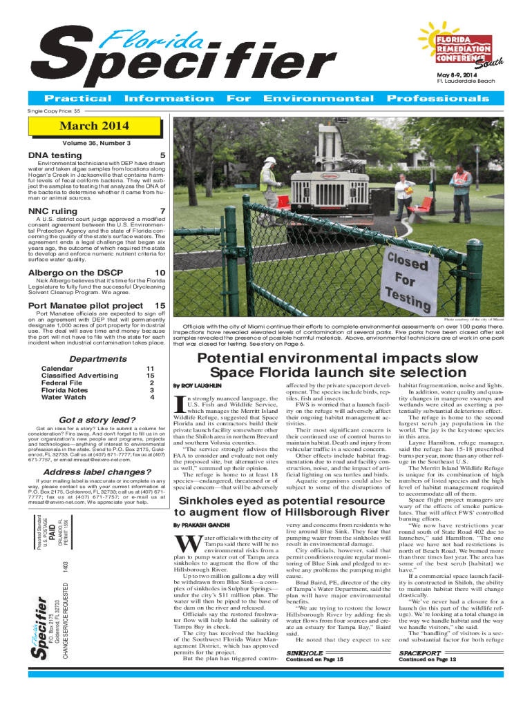 May 89, 2014 Ft. Lauderdale Beaching Copy Price: $5March 2014 Volume 36, Number 3DNA testing5Environmental technicians with DEP have drawn water and taken algae samples from locations along Hogans
