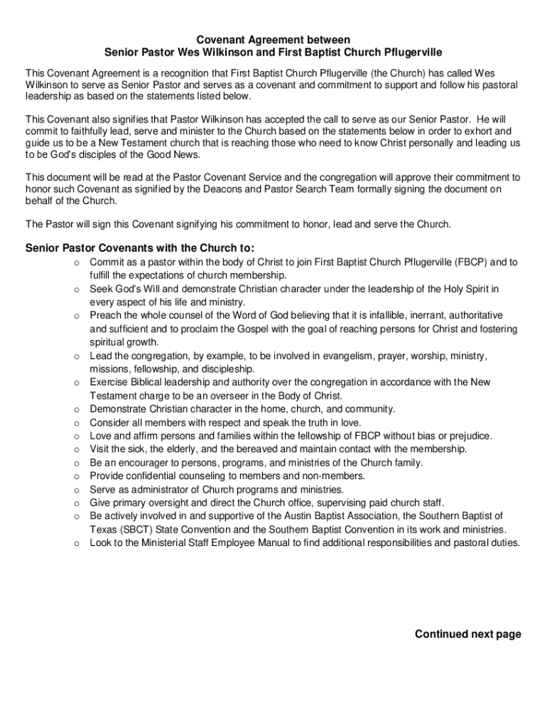 Covenant Agreement between Senior Pastor Was Wilkinson and First Baptist Church Pflugerville This Covenant Agreement is a recognition that First Baptist Church Pflugerville (the Church) has called
