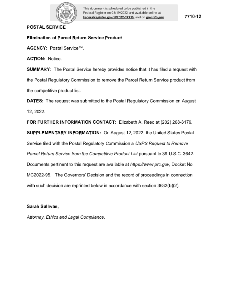 This document is scheduled to be published in the Federal Register on 08/19/2022 and available online at federalregister.gov/d/202217716, and on gov info.gov771012POSTAL SERVICE Elimination of Parcel