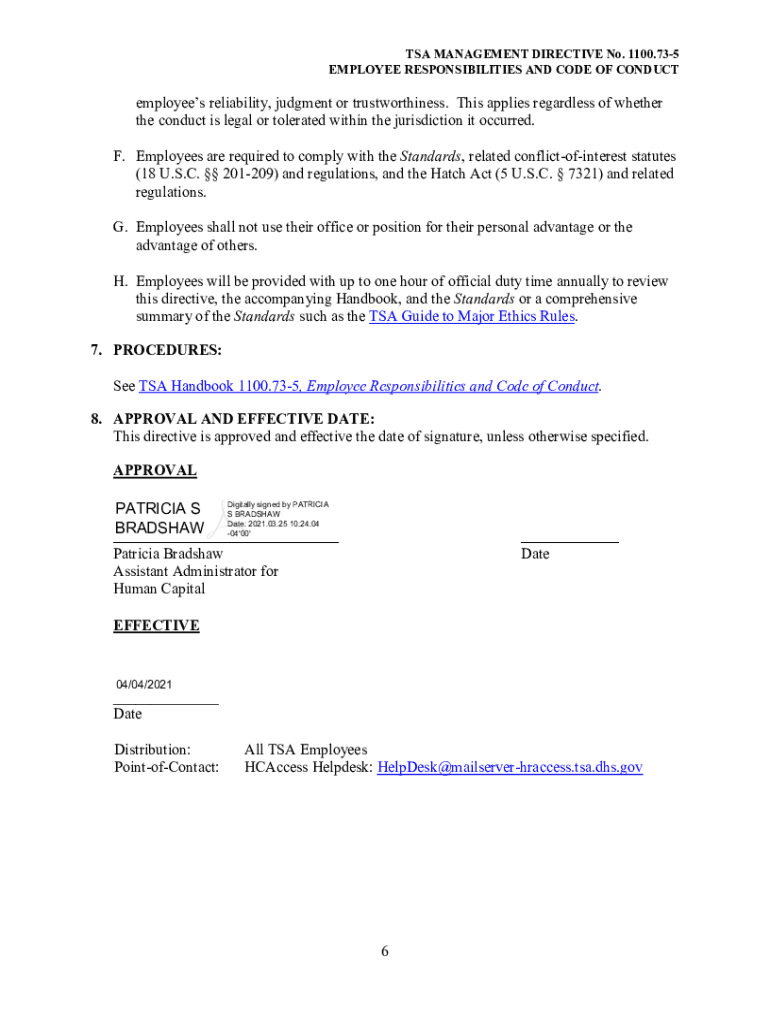 HUMAN CAPITAL TSA MANAGEMENT DIRECTIVE No. 1100.735 EMPLOYEE RESPONSIBILITIES AND CODE OF CONDUCT To enhance mission performance, TSA is committed to promoting a culture founded on its values of Integrity,