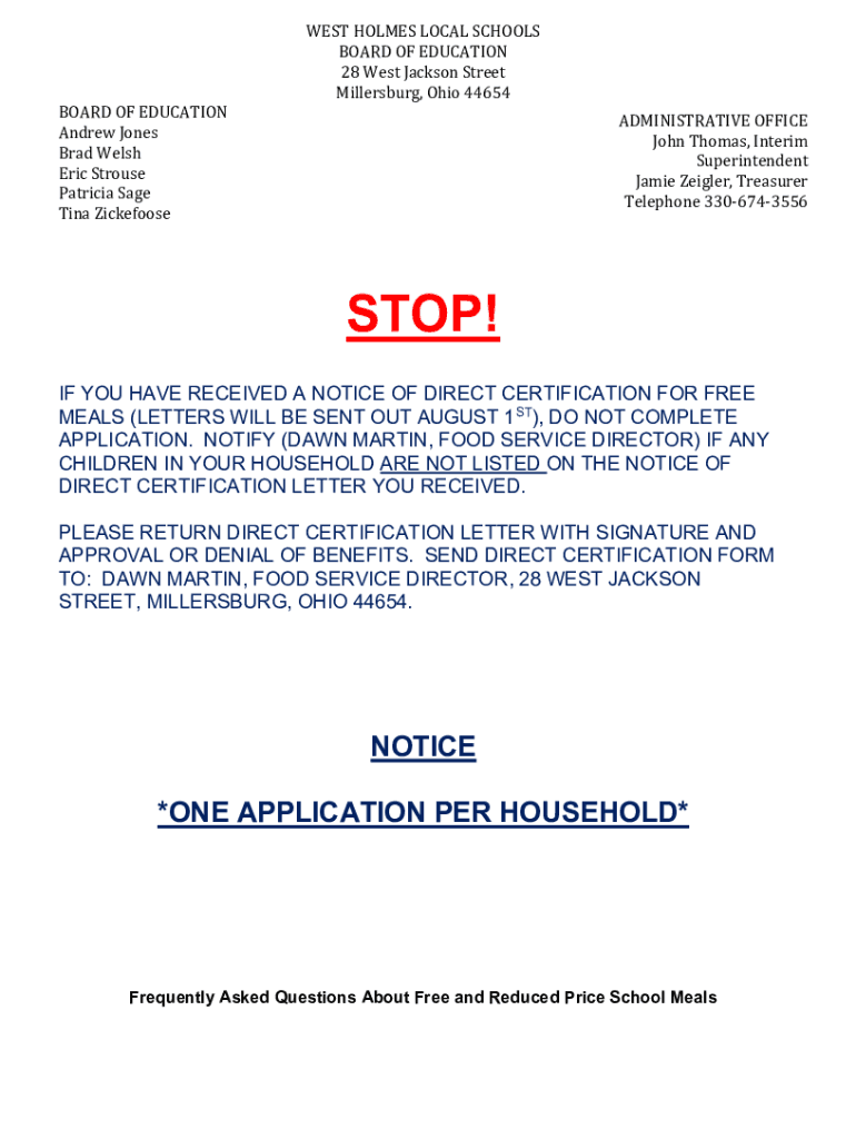 WEST HOLMES LOCAL SCHOOLS BOARD OF EDUCATION 28 West Jackson Street Millersburg, Ohio 44654 BOARD OF EDUCATION Andrew Jones Brad Welsh Eric St rouse Patricia Sage Tina ZickefooseADMINISTRATIVE OFFICE