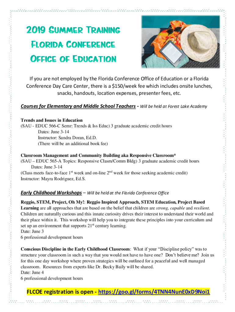If you are not employed by the Florida Conference Office of Education or a Florida Conference Day Care Center, there is a $150/week fee which includes onsite lunches, snacks, handouts, location expenses,