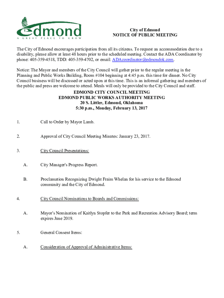 City of Edmond NOTICE OF PUBLIC MEETING TheCityofEdmondencouragesparticipationfromallitscitizens. Torequestanaccommodationduetoa disability,pleaseallowatleast48hourspriortothescheduledmeeting. ContacttheADACoordinatorby