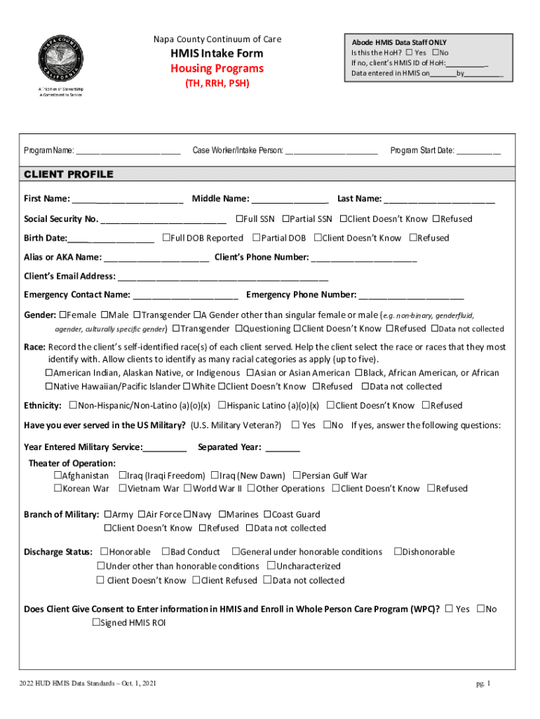 Get the free HMIS Intake Form Housing Programs - Bitfocus