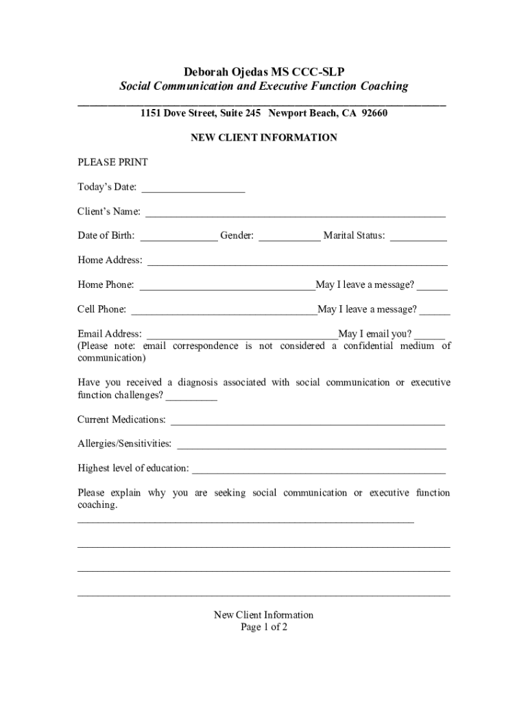 Deborah Operas MS CCC SLP Social Communication and Executive Function Coaching ___ 1151 Dove Street, Suite 245 Newport Beach, CA 92660 NEW CLIENT INFORMATION PLEASE PRINT Today's Date: ___ Clients