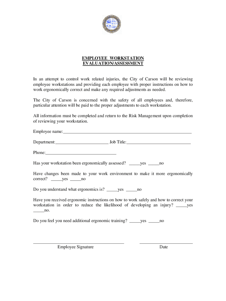 EMPLOYEE WORKSTATION EVALUATION/ASSESSMENT In an attempt to control work related injuries, the City of Carson will be reviewing employee workstations and providing each employee with proper instructions