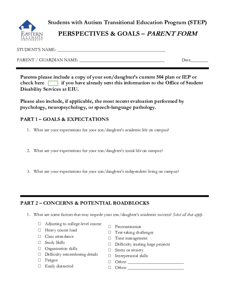 Students with Autism Transitional Education Program (STEP)PERSPECTIVES & GOALS PARENT FORM STUDENTS NAME: ___ PARENT / GUARDIAN NAME: ___Date___Parents please include a copy of your son/daughters