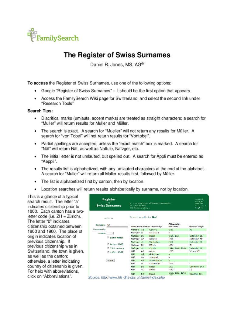 Daniel R. Jones, MS, Ago access the Register of Swiss Surnames, use one of the following options: