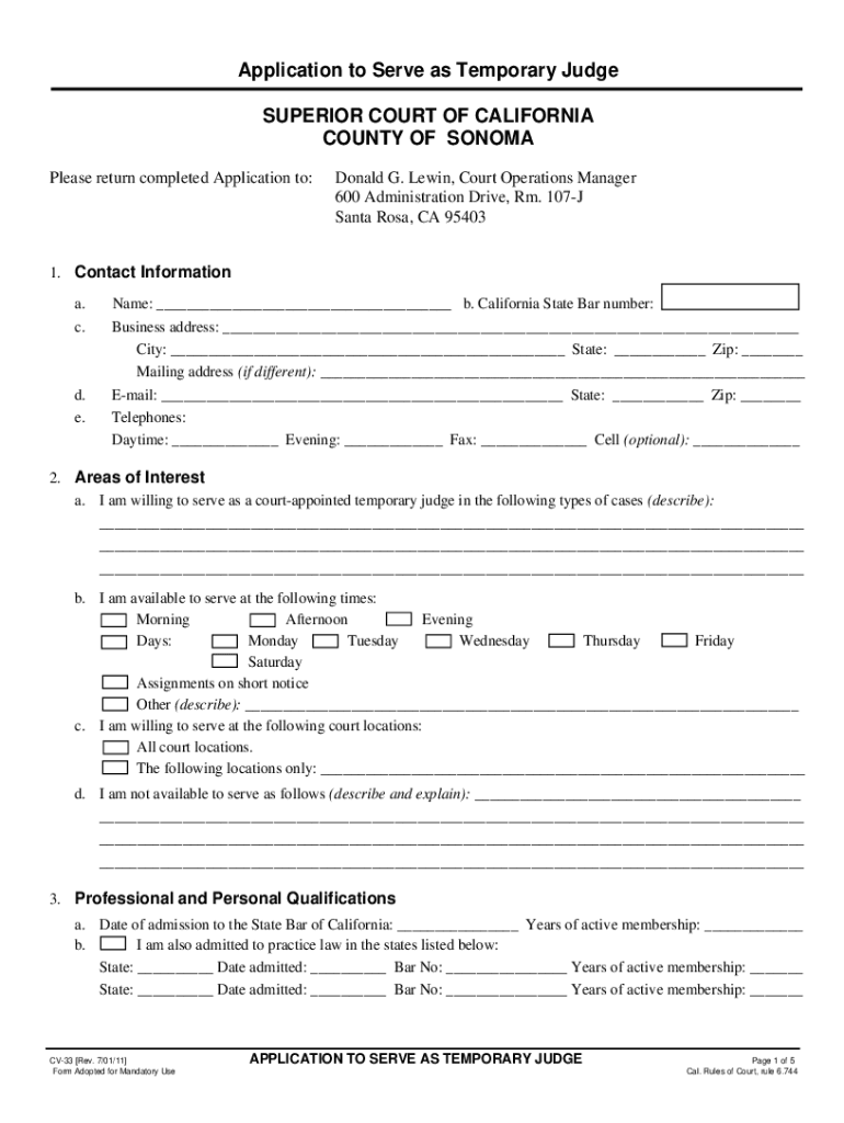 Application to Serve as Temporary Judge SUPERIOR COURT OF CALIFORNIA COUNTY OF SONOMA Please return completed Application to:Donald G. Lewin, Court Operations Manager 600 Administration Drive, Rm.