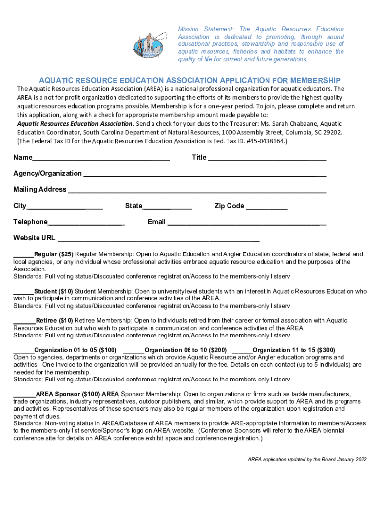 Get the free AREA Membership Application. Aquatic Resources Education Association Membership Form