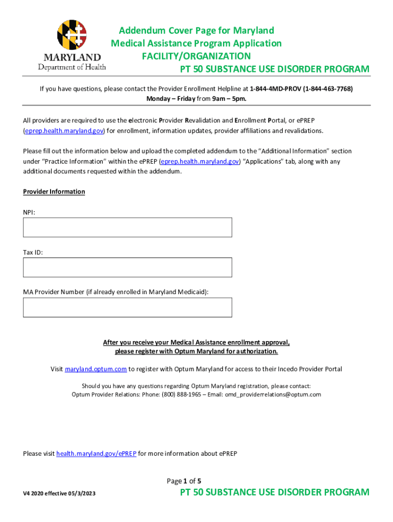 Addendum Cover Page for Maryland Medical Assistance Program Application FACILITY/ORGANIZATION PT 50 SUBSTANCE USE DISORDER PROGRAM If you have questions, please contact the Provider Enrollment Helpline