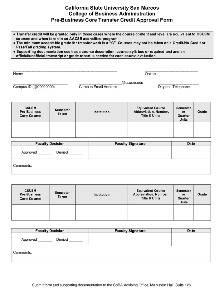 California State University San Marcos College of Business Administration Business Core Transfer Credit Approval Form Transfer credit will be granted only in those cases where the course content and